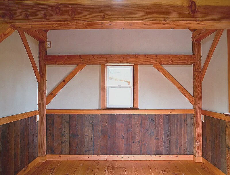 Every piece of this building was custom made by hand—from the mortise-and-tenon sill beams up to the hand-pegged joints of the rafters. The door and upper windows were shop-built with local and reclaimed Douglas Fir and Western Red Cedar. The clay plaster walls were hand-applied and troweled to a smooth finish.